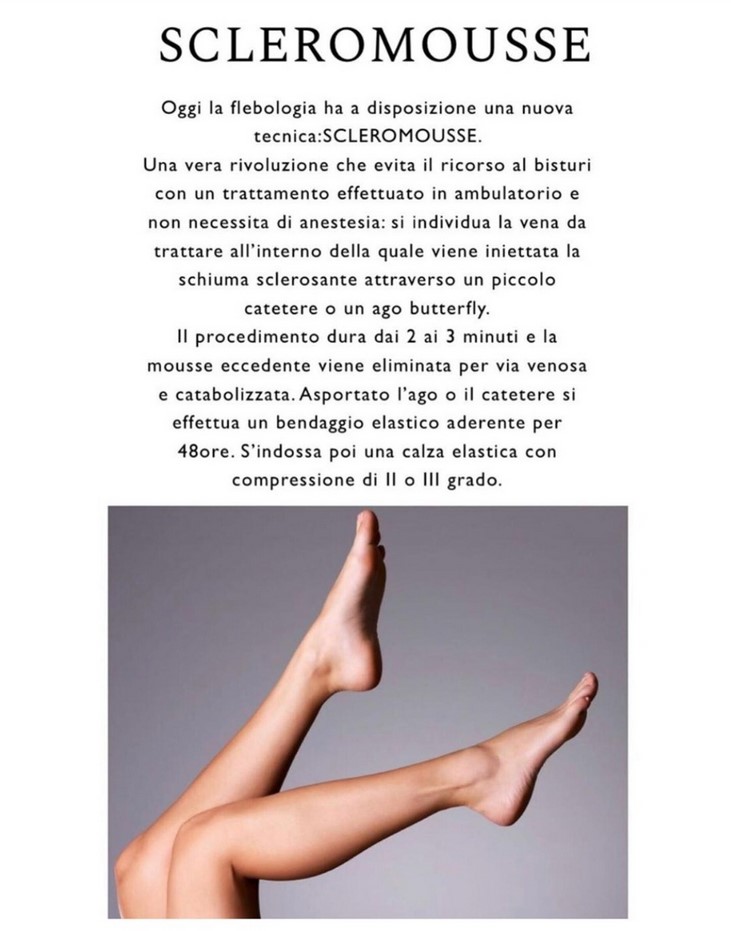 Cos’è la scleromousse? La scleromousse è una schiuma che deriva da un liquido particolare. Questa schiuma, quando viene iniettata nelle vene varicose, aiuta a chiuderle. Dopo il trattamento, si usa una calza speciale per garantire che le vene restino chiuse.